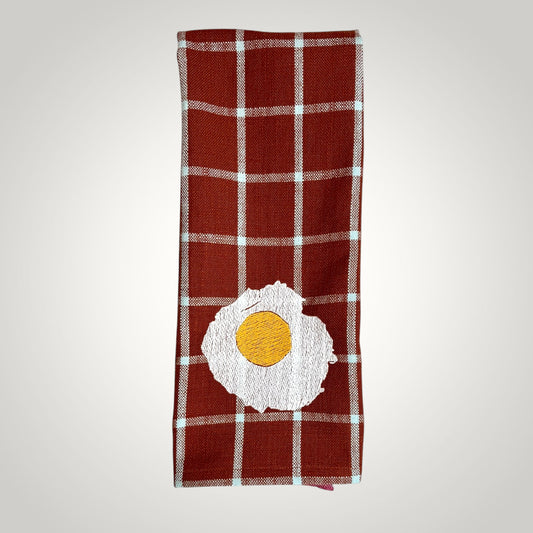 Embroidered Fried Egg Tea Towel - Red Plaid Kitchen Towel - Cotton Dish Towel - Quirky Kitchen Decor - Housewarming Gift - Breakfast Lover Gift